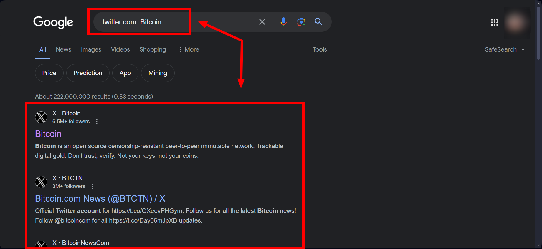 يقوم Google بفهرسة منصات التواصل الاجتماعي على نطاق واسع، بما في ذلك X (تويتر). يمكنك استخدام Google للعثور على التغريدات أو الملفات الشخصية ذات المحتوى المحدد عن طريق إدخال: site:twitter.com <topic>.