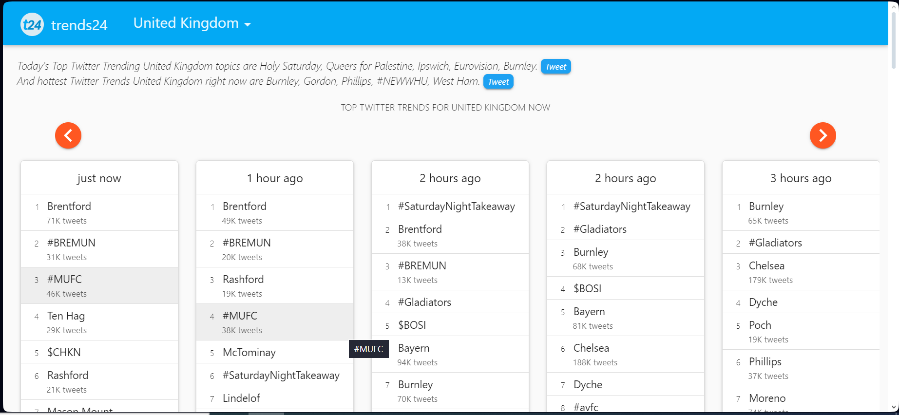 Trends24 يسلط الضوء على المواضيع والكلمات المفتاحية والوسوم (الهاشتاجات) الشائعة على X X (المعروف بـ Twitter) دون أي حاجة للتسجيل. تتيح لك هذه المنصة مراقبة ما هو شائع عالميًا وحسب الموقع الجغرافي المحدد. ومع ذلك، لمشاهدة التغريدات الفردية لكل اتجاه، ستحتاج إلى تسجيل الدخول إلى X (المعروف بـ Twitter).