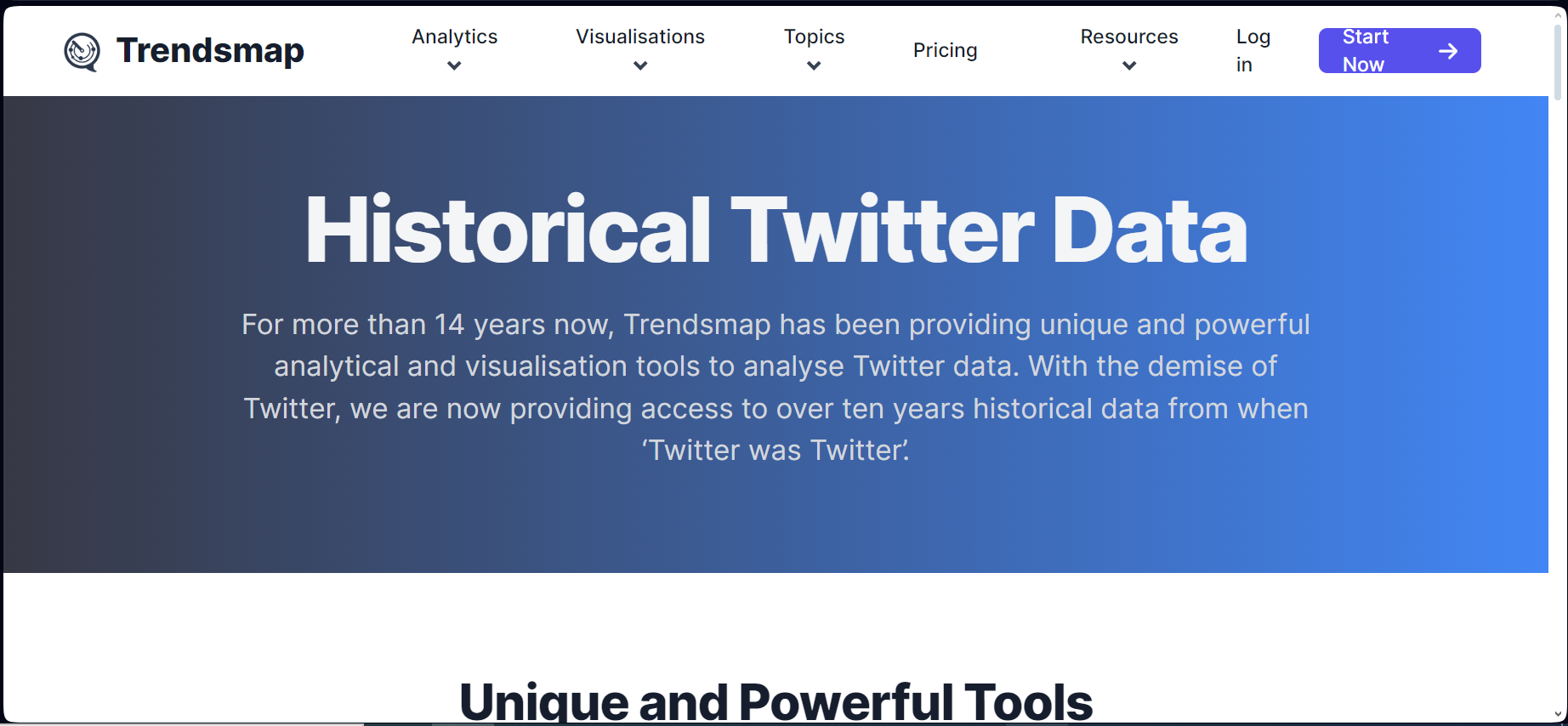 Trendsmap هي خدمة تحليل متعمقة توفر الوصول إلى بيانات X (المعروف بـ Twitter) التاريخية، التي تعود إلى عشر سنوات مضت، حتى بدون حساب. تقدم واجهة مبسطة لبحث الكلمات المفتاحية، بالإضافة إلى تحليلات مفصلة ورسم خرائط مرئي للاتجاهات. يرجى ملاحظة أن الوصول إلى التحليلات الكاملة قد يتطلب اشتراكًا.