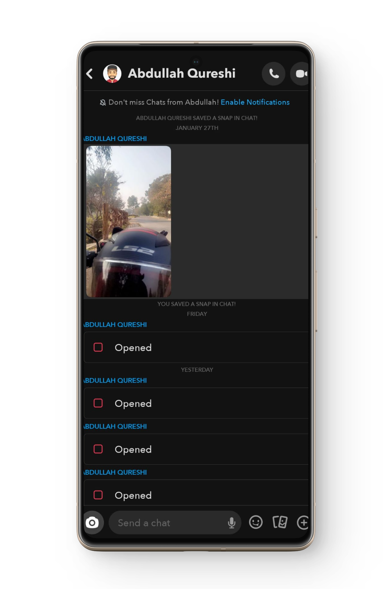 هناك خيار آخر وهو حفظ المحادثات واللقطات بحيث تبقى دائمًا في محادثتك. المشكلة في هذا هي أن المستخدم الآخر يتلقى إشعارًا بأنك حفظت محادثة، وهذا سيجعل الموقف محرجًا. علاوة على ذلك، يمتلك المستخدم الآخر دائمًا القدرة على إلغاء حفظ تلك المحادثة، لذا هذه ليست طريقة مضمونة.