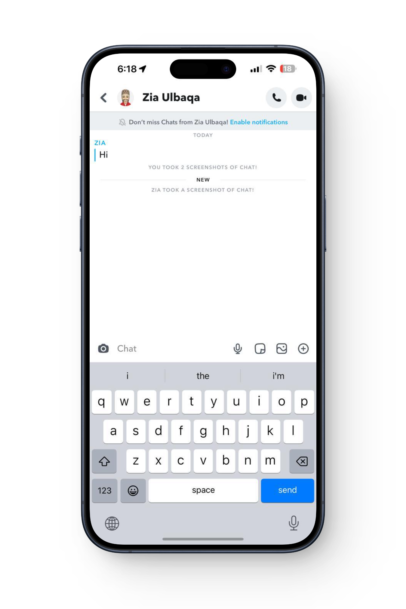 لسوء حظ مستخدمي iPhone، لا توجد طريقة مباشرة لالتقاط لقطة شاشة. Google Assistant غير متاح، وإذا استخدمت Siri (مساعد iPhone) لالتقاط لقطة شاشة، فسيتم إخطار المستخدم الآخر. بالإضافة إلى ذلك، لم ينجح أي تطبيق تابع لجهة خارجية على App Store في التقاط لقطات شاشة سرية.