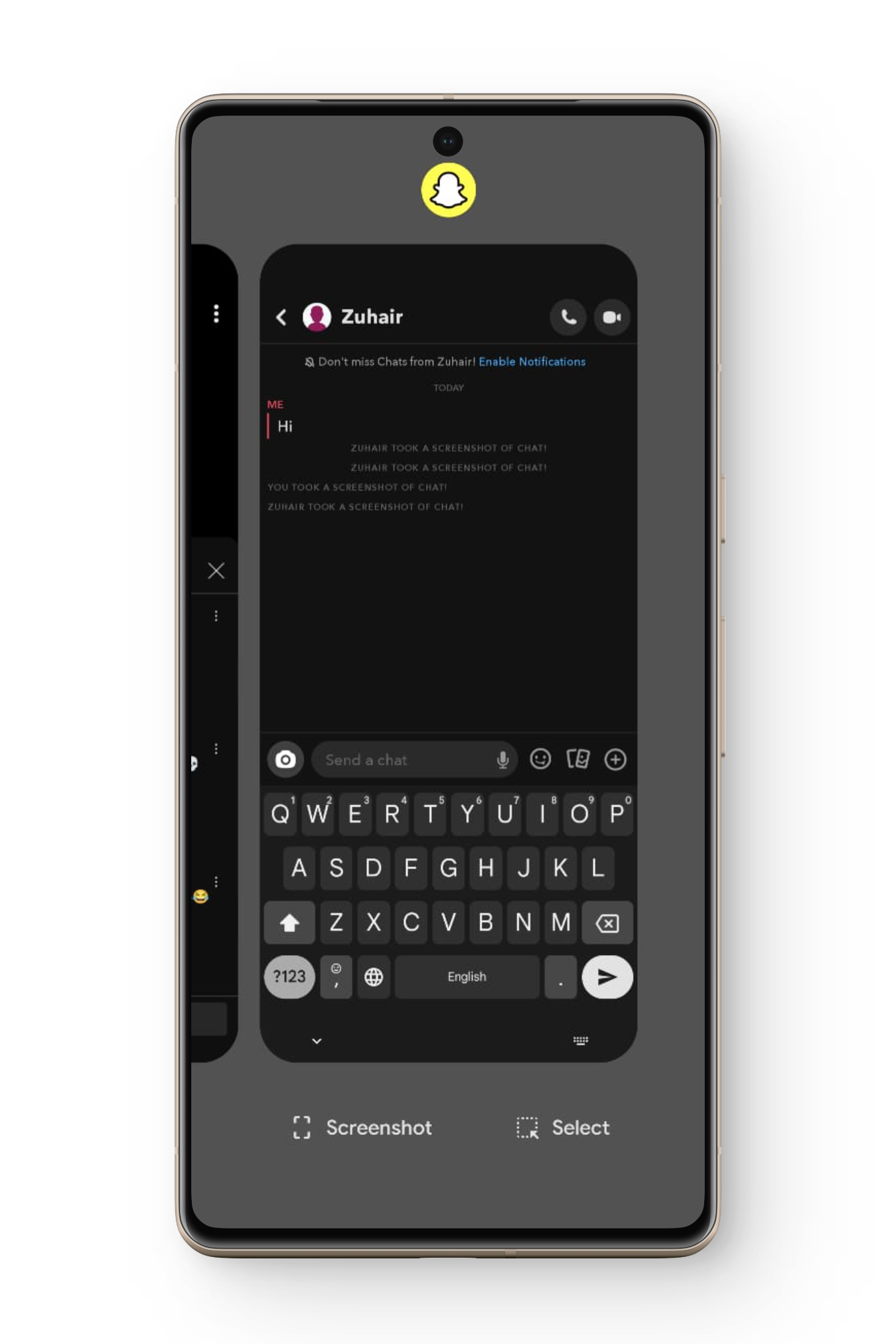 طريقة قديمة أخرى مشهورة كانت تتمثل في فتح الدردشة، ثم الانتقال فورًا إلى التطبيقات الحديثة، والتقاط لقطة شاشة. كانت هذه الطريقة صالحة قبل بضعة أشهر؛ ومع ذلك، يكتشف Snapchat الآن هذا ويرسل إشعارًا إلى المستخدم الآخر.