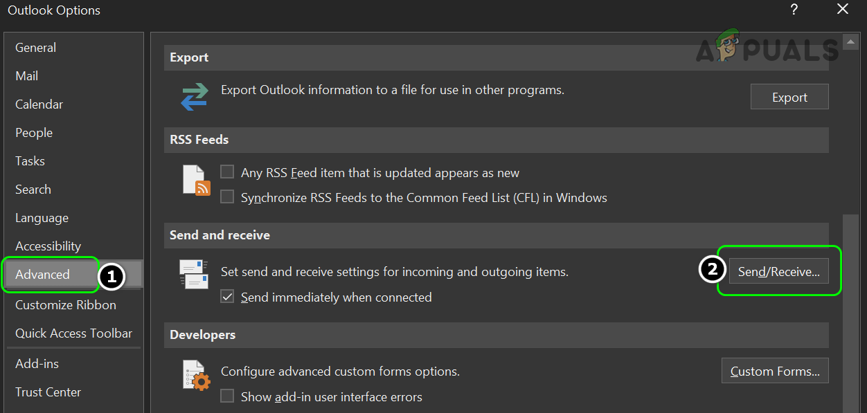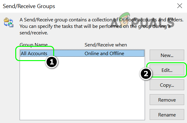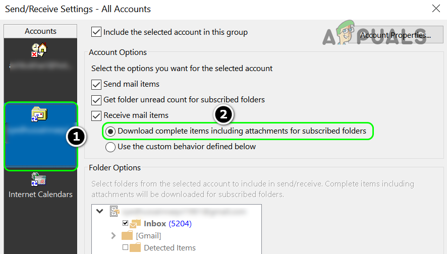 3. في قسم الإرسال/الاستلام، انقر فوق إرسال/استلام وحدد جميع الحسابات أو حدد الحساب الذي به مشكلة إذا كان مدرجًا.