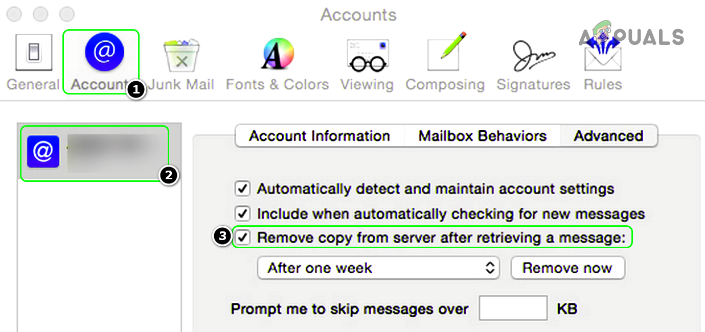 3. انتقل إلى علامة التبويب متقدم و ألغِ تحديد خيار إزالة نسخة من الخادم بعد استرداد الرسالة. قد تحتوي بعض الأجهزة على خيارات مثل “عدم الحذف من الخادم أبدًا” أو “ترك نسخة على الخادم”.