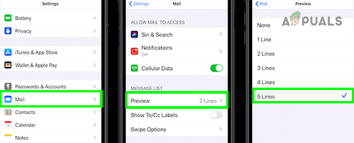 2. في قسم قائمة الرسائل، اضغط على معاينة واختر 5 أسطر.