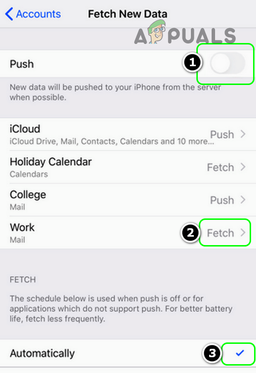4. اضبط جميع الحسابات الأخرى التي تعرض Push على Fetch وأعد تشغيل iPhone.