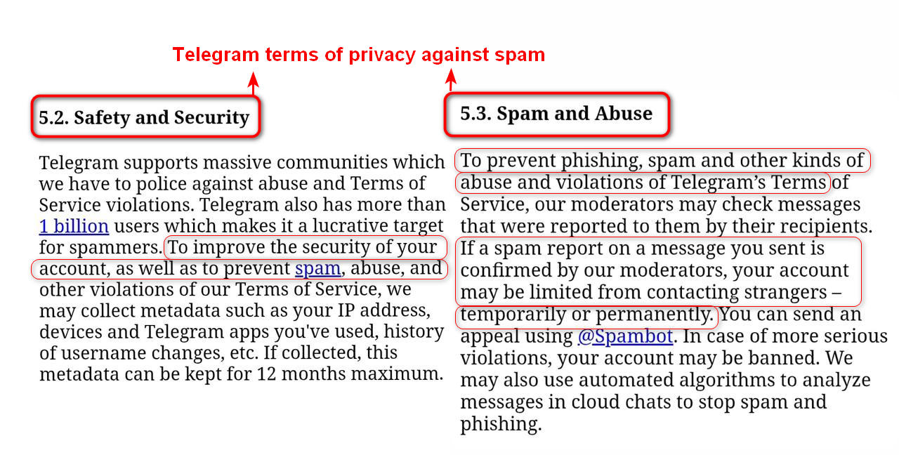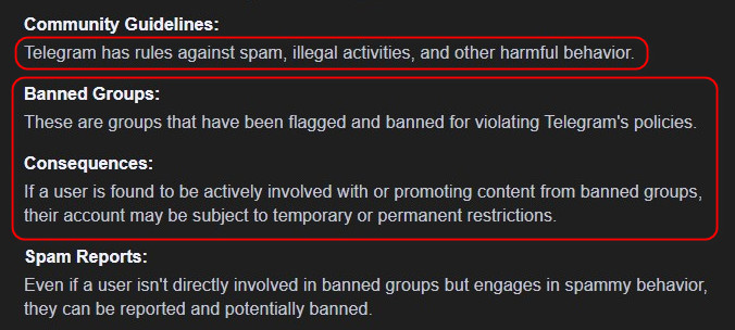 > تؤكد سياسة خصوصية Telegram أن مجرد العضوية السلبية في المجموعات غير القانونية يمكن أن يؤدي إلى الحظر.