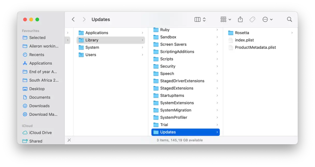/Library/Updates. احذف جميع الملفات والمجلدات الموجودة بداخله. هذا المجلد يخزن ملفات التحديثات المؤقتة، وقد يكون أحد هذه الملفات تالفًا ويتسبب في المشكلة. - ثم، ابحث عن المجلد “/macOS Install Data” باستخدام Finder. إذا وجدته، احذفه. يحتوي هذا المجلد على بيانات تثبيت macOS، وإزالته قد تحل مشكلات التحديث العالقة.