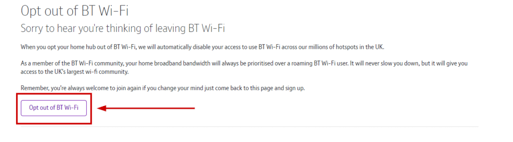 ضع في اعتبارك أيضًا أن إلغاء الاشتراك في BT Wi-Fi سيعطل إذنك باستخدام شبكة BT Wi-Fi المنتشرة عبر ملايين النقاط الساخنة في المملكة المتحدة.