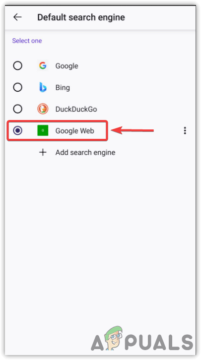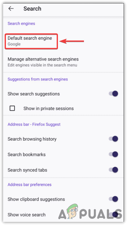 - انقر على بحث ضمن الإعدادات العامة، ثم انقر على محرك البحث الافتراضي.