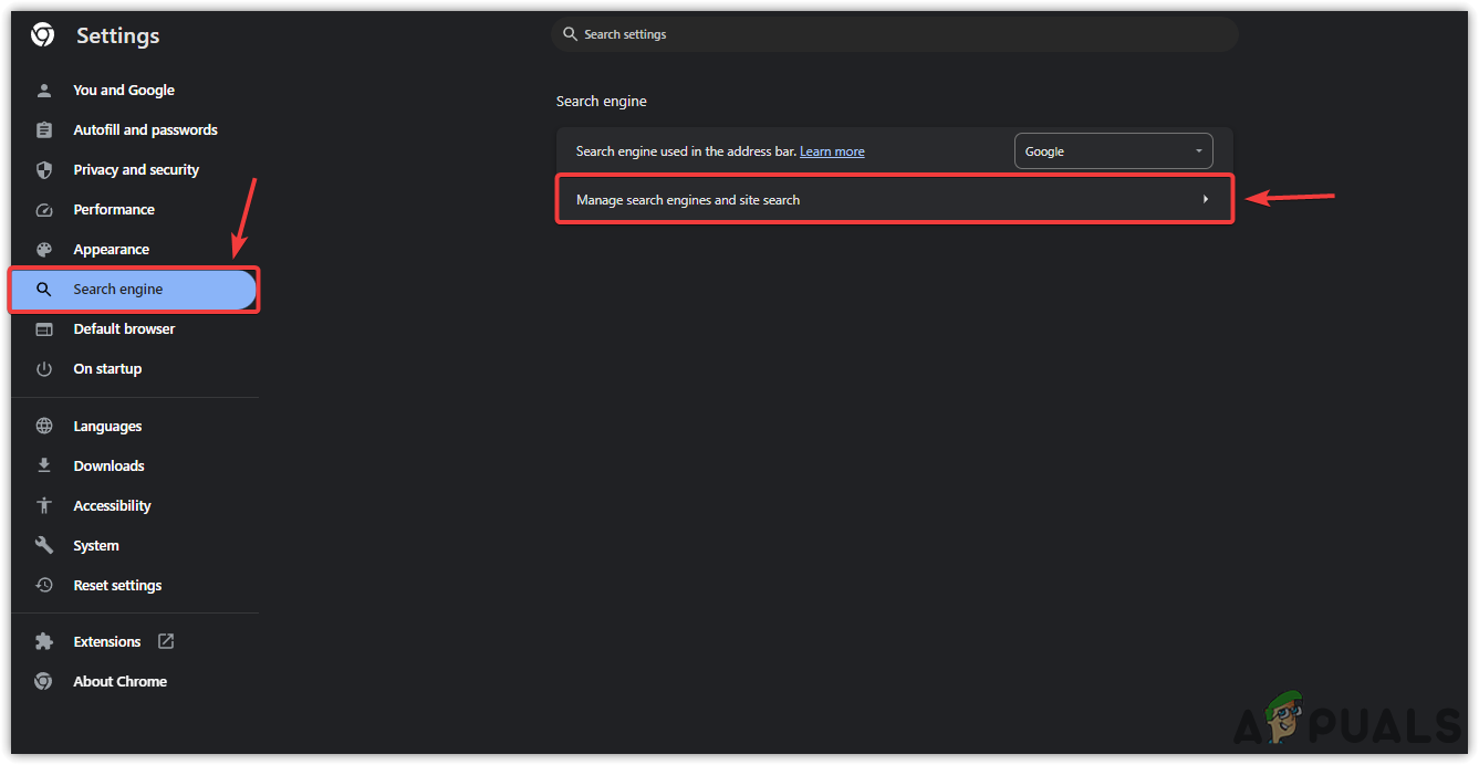 - اذهب إلى محرك البحث من الشريط الجانبي الأيسر. هنا، انقر على إدارة محركات البحث والبحث في المواقع.