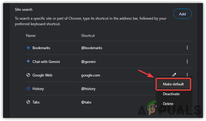 - بعد الانتهاء، انقر على إضافة. ثم، انقر على النقاط الثلاث المرتبطة ببحث الموقع الذي أنشأته للتو، ثم حدد جعله افتراضيًا.