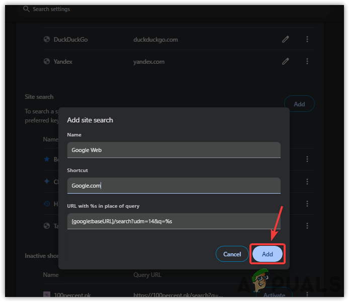 الاسم: Google Web الاختصار: Google.com عنوان URL: {google:baseURL}/search?udm=14&q=%s