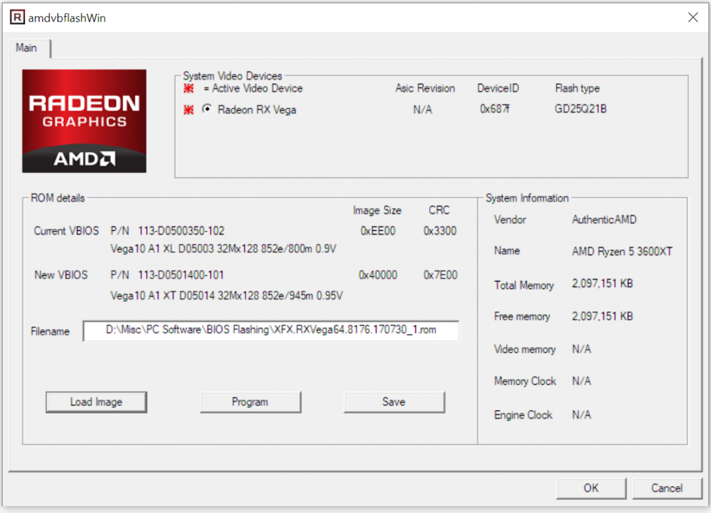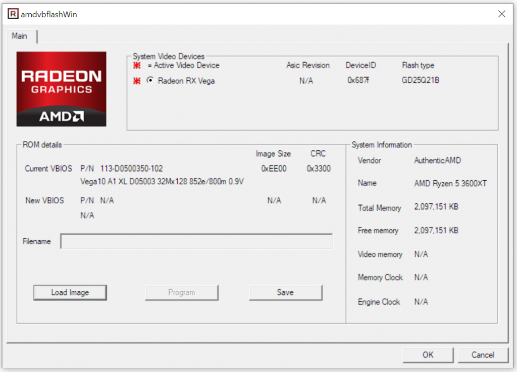 ATiFlash (يُعرف أيضًا باسم AMD VBFlash) هو الأداة المفضلة لهذه العملية عندما يتعلق الأمر ببطاقات رسومات AMD. الأداة بسيطة وسهلة الاستخدام. يمكن تنزيلها مجانًا من هنا. بالنسبة لبطاقات Nvidia، البديل هو NVFlash.