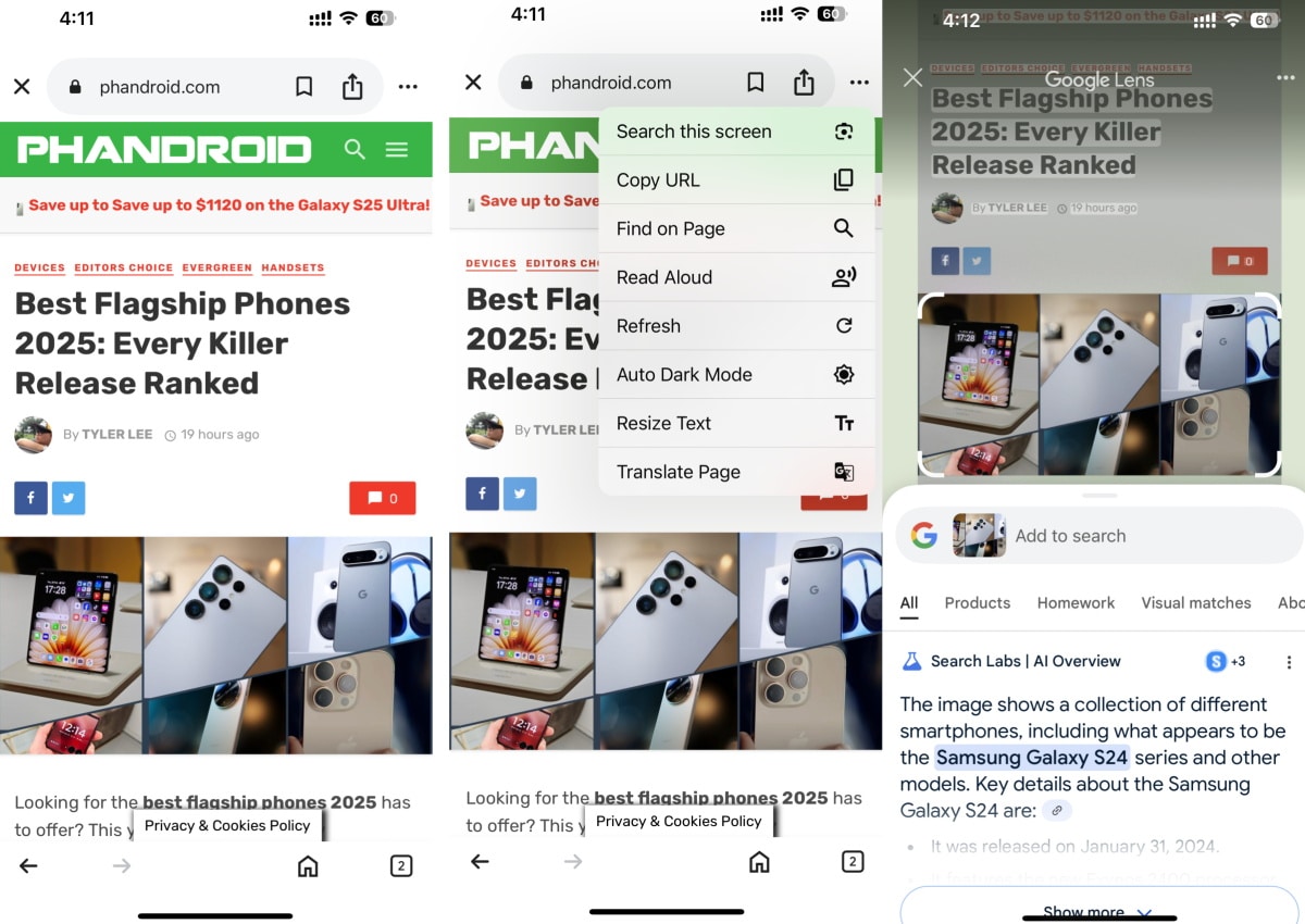 - بديل الوصول إلى الميزة: يمكنك أيضاً النقر على أيقونة النقاط الثلاث الموجودة في شريط التنقل السفلي، ثم اختيار “البحث عن الشاشة باستخدام Google Lens” (Search screen with Google Lens). هذه الطريقة توفر وصولاً بديلاً وسريعاً للميزة.