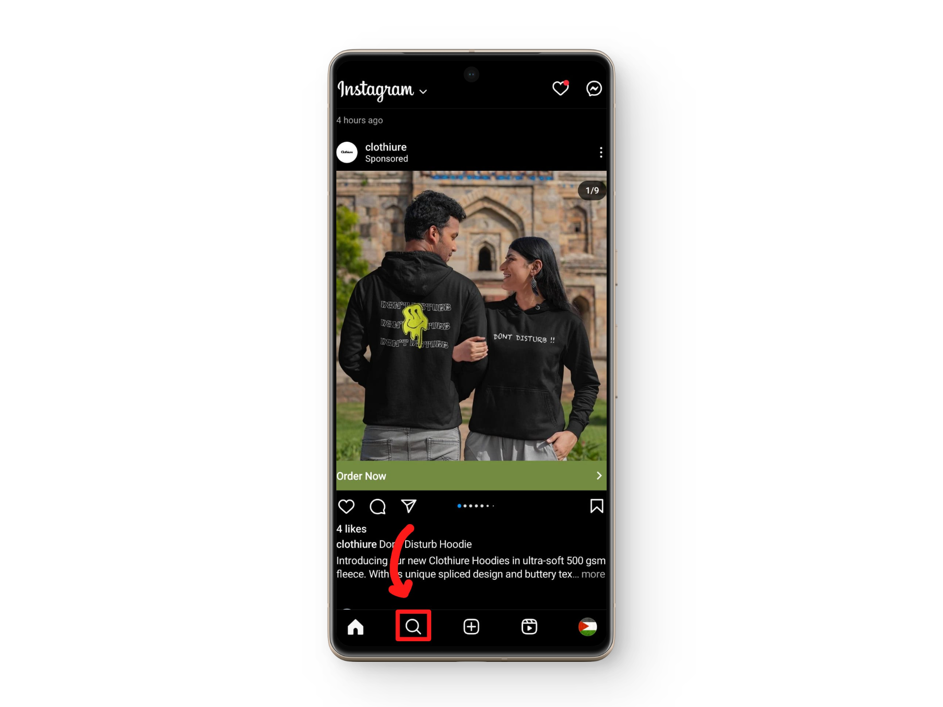 1. افتح تطبيق Instagram وانقر على أيقونة البحث بجانب أيقونة الصفحة الرئيسية.