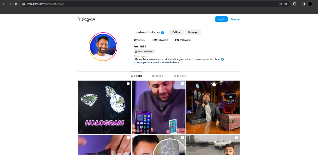 بمجرد فتح الملف الشخصي في متصفحك، يمكنك التمرير لأسفل لمشاهدة الوسائط التي نشرها المستخدم. في البداية، ستكون جميع الوسائط المنشورة على الحساب مرئية. إذا كنت ترغب فقط في مشاهدة مقاطع Reels، فانقر على خيار Reels (الموضح أعلاه كمرجع).