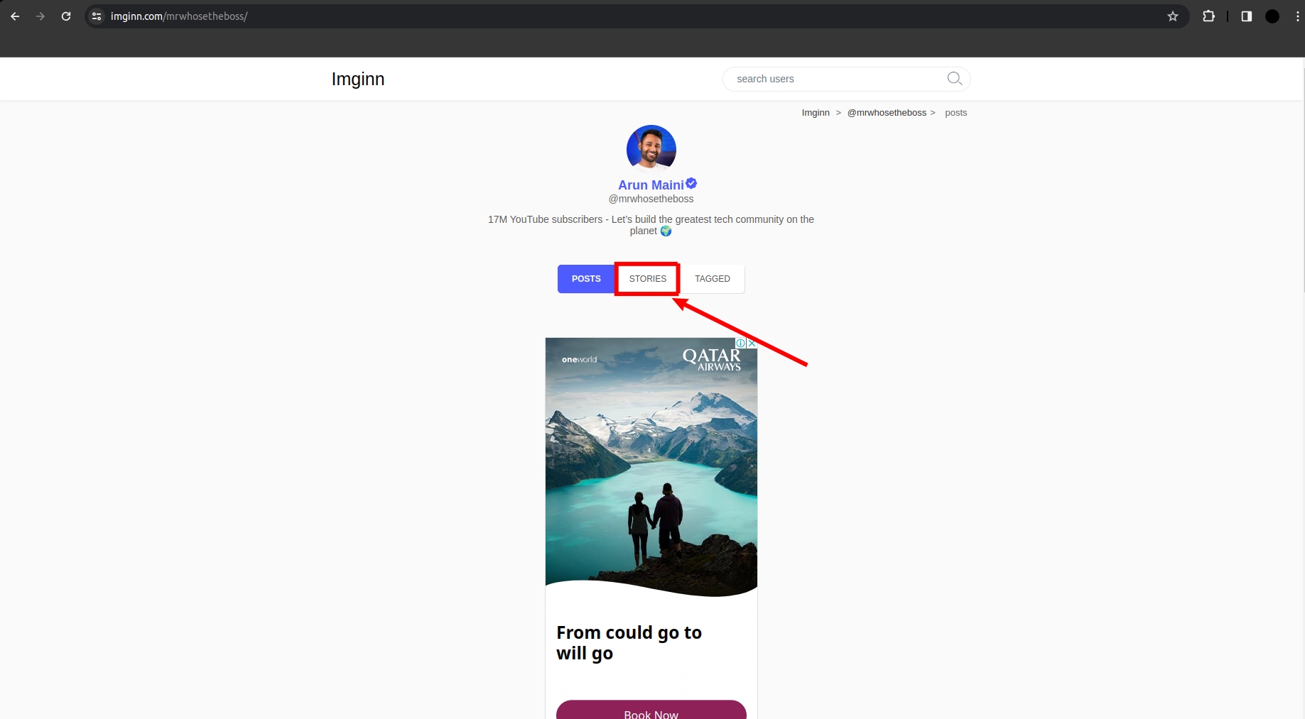 5. لمشاهدة قصص المستخدم، انقر على خيار القصص. إذا تم نشر أي قصص خلال الـ 24 ساعة الماضية، فستظهر هنا. وإلا، فسيتم عرض “لا توجد قصص”.
