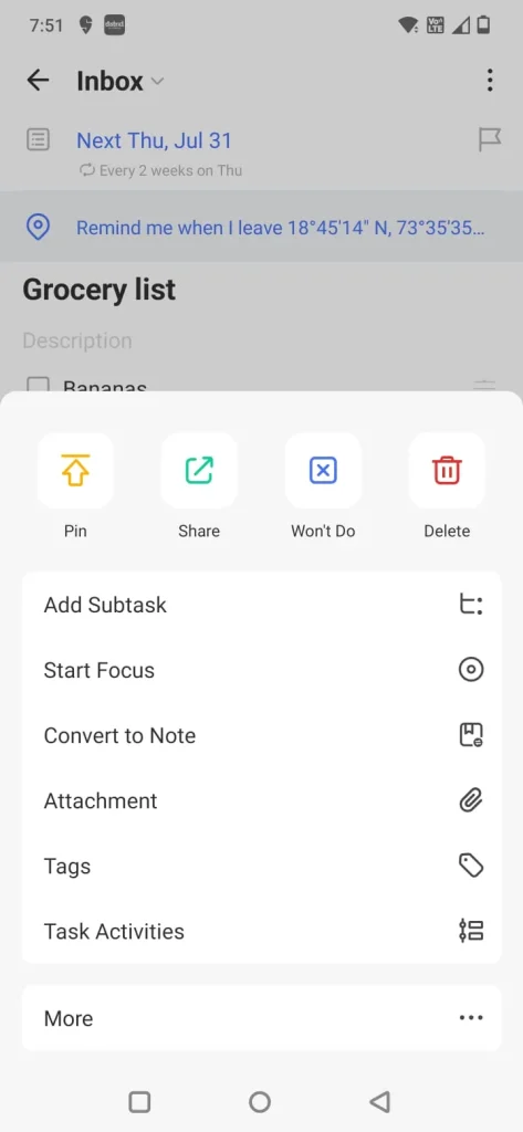 بالنسبة للتسوق، تعمل ميزة قوائم المهام في TickTick بشكل ممتاز. يمكنني إنشاء قوالب قوائم بقالة قابلة لإعادة الاستخدام، ومشاركة القوائم مع العائلة، وتعيين تذكيرات مرتبطة بالموقع الجغرافي (مثل ذكرني عندما أغادر [المكان]). هذه الميزة تحديدًا تجعل تجربة التسوق أكثر سلاسة وفعالية.
