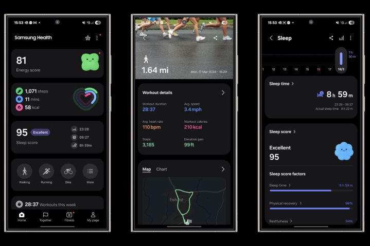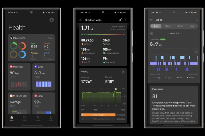 أُعجبتُ كثيرًا بشاشة Samsung على شكل قلب لعرض بيانات النشاط اليومي، وكذلك بمقياس Energy Score. لا يمتلك تطبيق OHealth مقياسًا واحدًا سريعًا مثل هذا، مما يجعله يبدو أقل تخصيصًا. ومع ذلك، أحببتُ طريقة عرض بيانات الإجهاد والنوم على المعصم، ولا حاجة تُذكر لفتح تطبيق OHealth. يُعتبر تطبيق Samsung Health والتطبيقات المرتبطة به واللازمة لميزات الصحة المتقدمة أكثر تكاملاً مع التجربة.