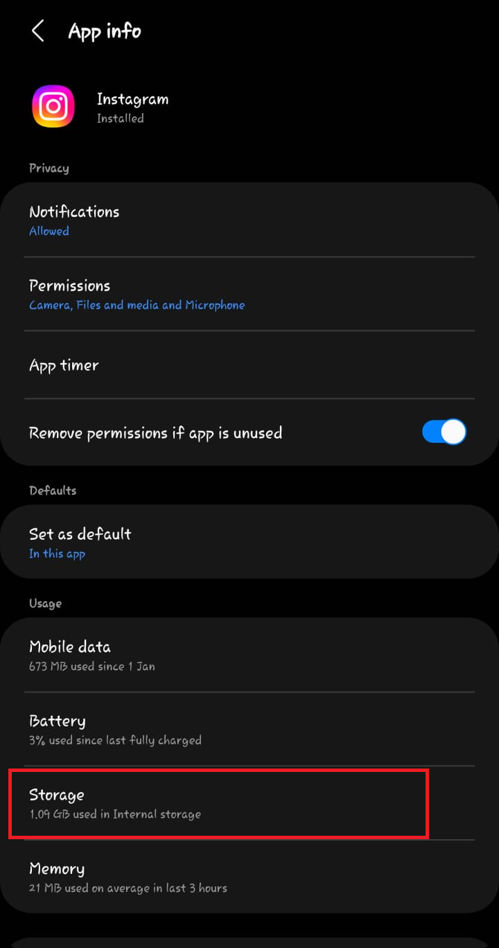 قد يؤدي تشغيل تطبيق Instagram لفترات طويلة دون مسح ذاكرة التخزين المؤقت والبيانات المخزنة إلى حدوث مشكلات في الوظائف. حل هذه المشكلة بالانتقال إلى إعدادات هاتفك ومسح البيانات وذاكرة التخزين المؤقت للتطبيق. سيؤدي هذا إلى مسح جميع البيانات المحفوظة المتعلقة بالتطبيق، وستحتاج إلى تسجيل الدخول مرة أخرى.
