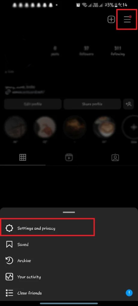 - انتقل إلى ملفك الشخصي، انقر على قائمة الهامبرغر في الزاوية العلوية اليمنى، واختر الإعدادات والخصوصية.