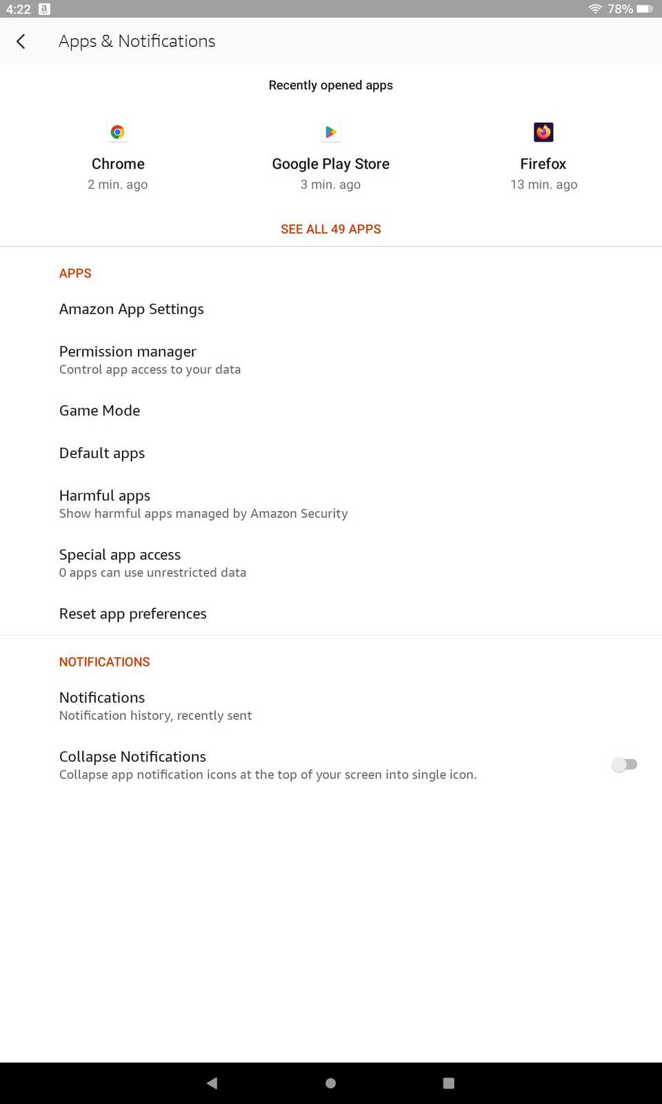 - افتح تطبيق الإعدادات، ثم اضغط على التطبيقات والإشعارات، ثم اختر عرض جميع التطبيقات. قد تختلف هذه الخيارات قليلاً حسب إصدار Fire OS الذي تستخدمه.