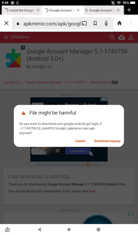 عند تنزيل ملفات APK هذه من APK Mirror، قد يحذرك متصفح Silk الخاص بـ Amazon بشأن ملفات غير آمنة. إذا ظهرت هذه النافذة المنبثقة، فانقر على Download anyway (تنزيل على أي حال).