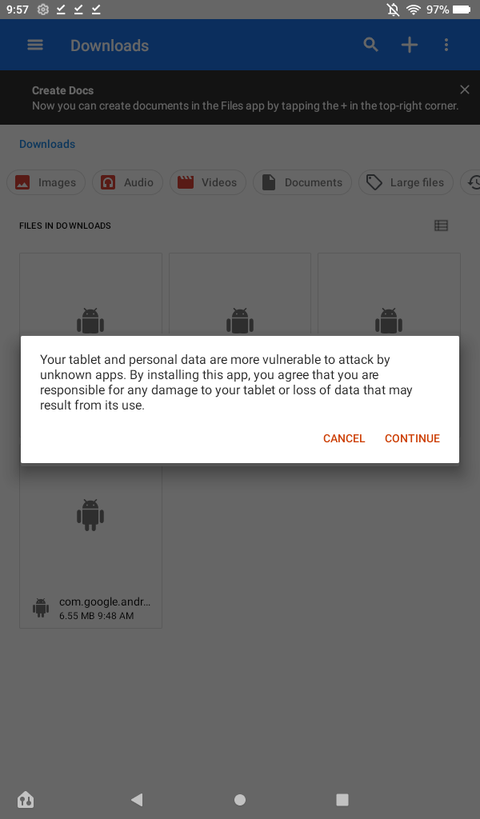 لا تفتح الملفات بعد. هناك بضع خطوات أخرى تحتاج إلى إكمالها. إذا ظهرت لك رسالة حول وجود إصدار أحدث، تجاهلها. سيقوم الجهاز اللوحي بتحديث التطبيقات بعد انتهاء عملية التثبيت.