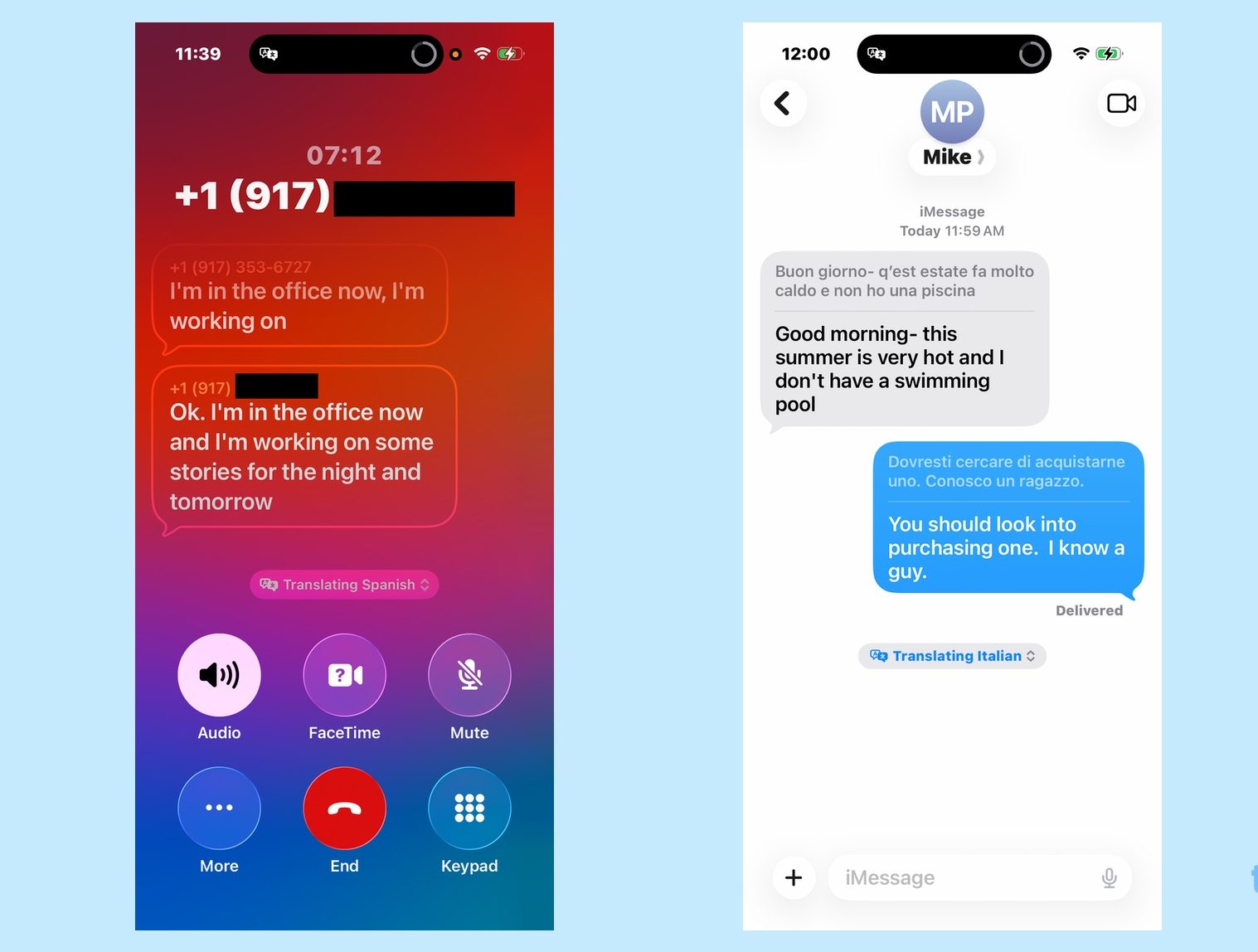 وفي الوقت نفسه، تحصل الهواتف التي تدعم Apple Intelligence على دفعة كبيرة لتطبيقي الهاتف و FaceTime – ترجمات مباشرة حتى تتمكن من إجراء محادثة مع شخص بلغة أخرى. يتم دعم لغات محددة فقط في الوقت الحالي، وستحتاج إلى تنزيل اللغة المناسبة من تطبيق Translate لكي تعمل الميزة بسلاسة.