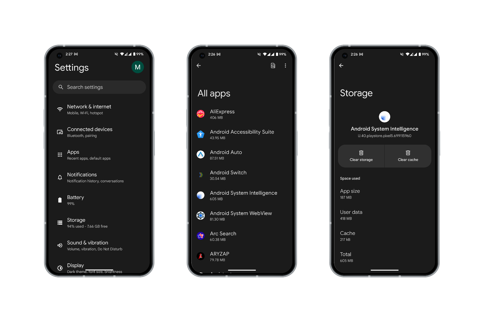 بالنسبة للمستخدمين الذين يواجهون أعطالًا مع Android System Intelligence، فقد أدى مسح ذاكرة التخزين المؤقت إلى حل المشكلة للكثيرين. قد يفسر هذا أيضًا سبب وجود أخطاء في اكتشاف الموسيقى في Now Playing و Circle to Search.