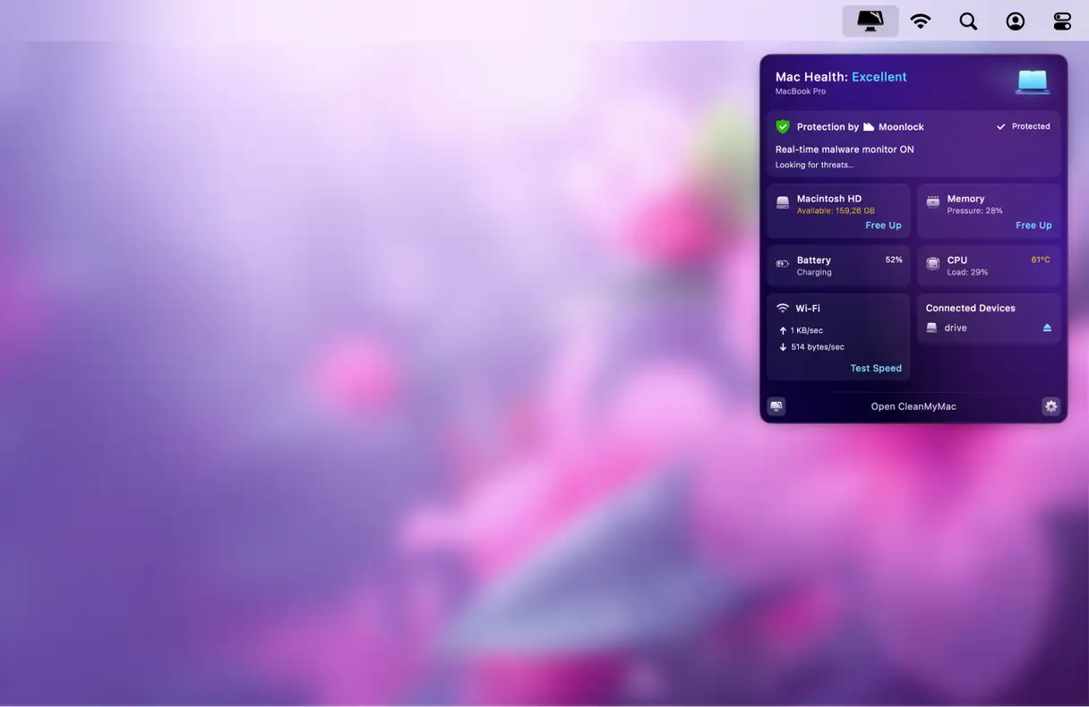 لتحسين أداء جهاز MacBook Pro وتقليل بطء الاستجابة، عادةً ما يتطلب الأمر تحديد السبب الجذري للمشكلة وإصلاحه، وهي عملية قد تستغرق وقتًا وجهدًا كبيرين. ولكن، هناك طريقة أسهل وأكثر فعالية: تطبيق القائمة الخاص بـ CleanMyMac. يتيح لك هذا التطبيق التحكم الكامل في العمليات التي تجري في الخلفية، مما يساعد بشكل كبير في تحسين الأداء العام للجهاز. بالإضافة إلى ذلك، يوفر لك تقارير مفصلة حول حالة جهاز Mac الخاص بك.