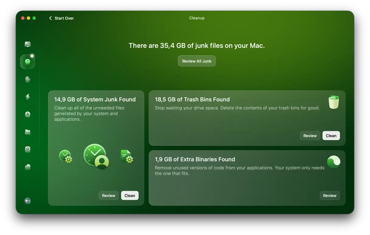إذا لم تجد سببًا واضحًا لبطء أداء جهاز MacBook Pro M1 حتى الآن، فمن المستحسن تنظيف الملفات غير الضرورية المتراكمة على جهاز Mac الخاص بك، فقد يكون هذا هو السبب الجذري للمشكلة. تشمل هذه الملفات غير الضرورية ملفات ذاكرة التخزين المؤقت القديمة (cache files)، والملفات المؤقتة التي كان من المفترض حذفها ولكنها بقيت، وملفات اللغات التي لا تحتاجها، وأنواع مختلفة من ملفات ذاكرة التخزين المؤقت. أسهل طريقة للتحقق من هذه الملفات والتخلص منها هي استخدام ميزة “Cleanup” في برنامج CleanMyMac، وهو أداة قوية لتحسين أداء Mac والتخلص من الملفات غير المرغوب فيها.