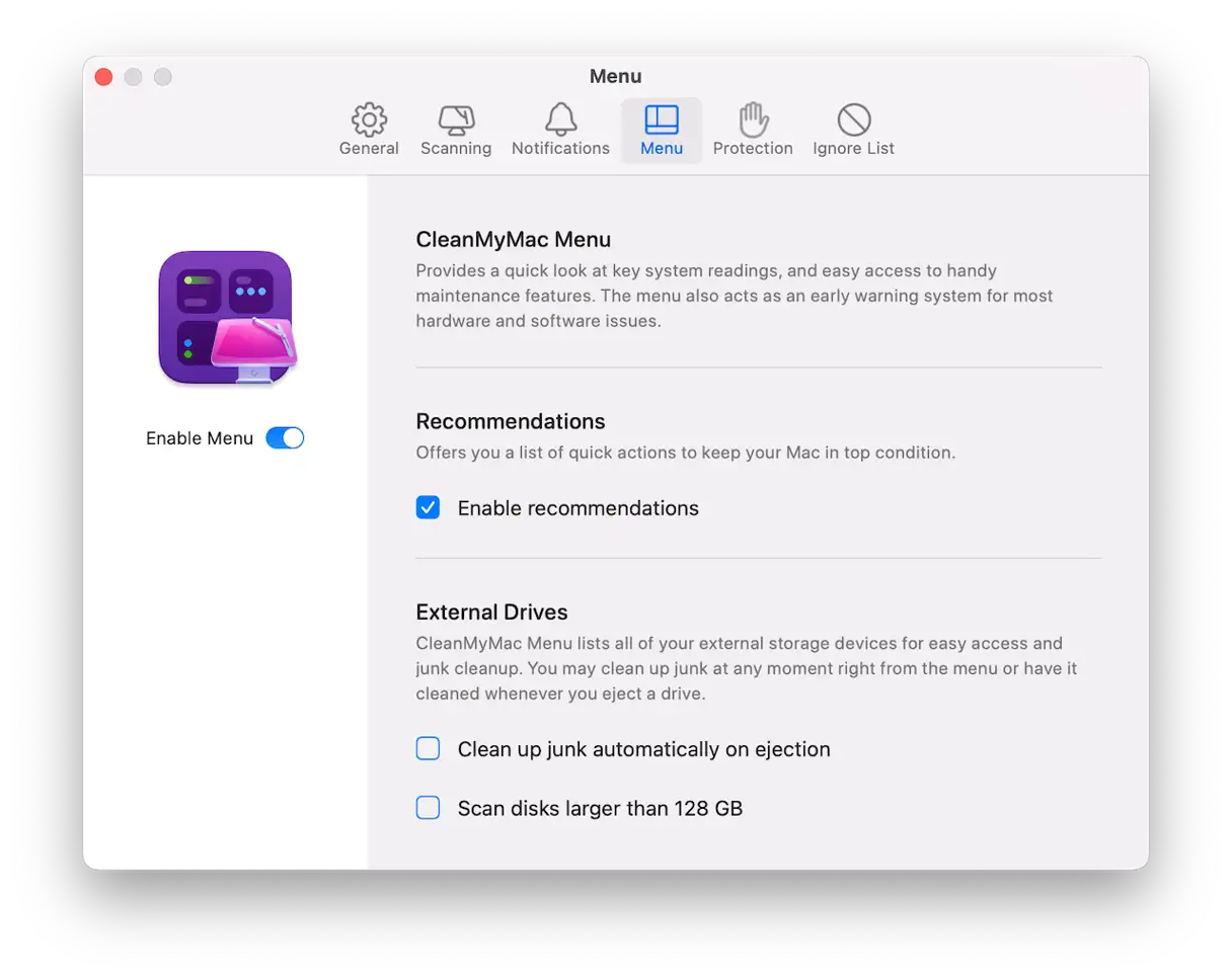 إذا لم تتمكن من رؤية أيقونة iMac في شريط القائمة، افتح CleanMyMac وانتقل إلى الإعدادات (Settings) > القائمة (Menu) لتمكينها.