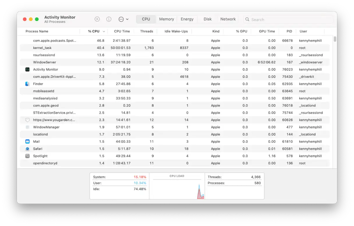 - كرر الخطوة 2 لعلامتي التبويب “الذاكرة” (Memory) و “الطاقة” (Energy) لتحديد العمليات التي تستهلك كميات كبيرة من الذاكرة أو الطاقة، مما قد يؤثر على أداء جهاز MacBook وعمر البطارية.