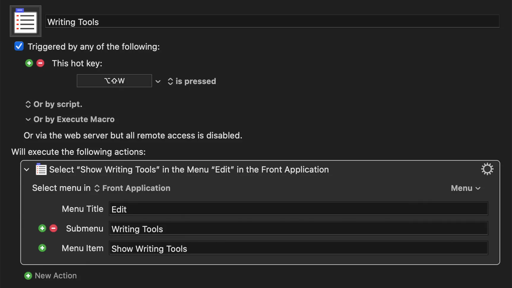 لقد كنت مستخدمًا متعطشًا لـ Keyboard Maestro لأكثر من عقد من الزمان، لكنني أعلم أن macOS أصبح جيدًا جدًا في هذا أيضًا، لذلك سيعمل هذا بأي طريقة. على Keyboard Maestro، قمت بتسجيل Option + Shift + W كاختصار لـ Edit > Writing Tools > Show Writing Tools. الآن، يمكنني عرض النافذة المنبثقة Writing Tools على الفور (وبشكل ثابت) متى احتجت إليها.