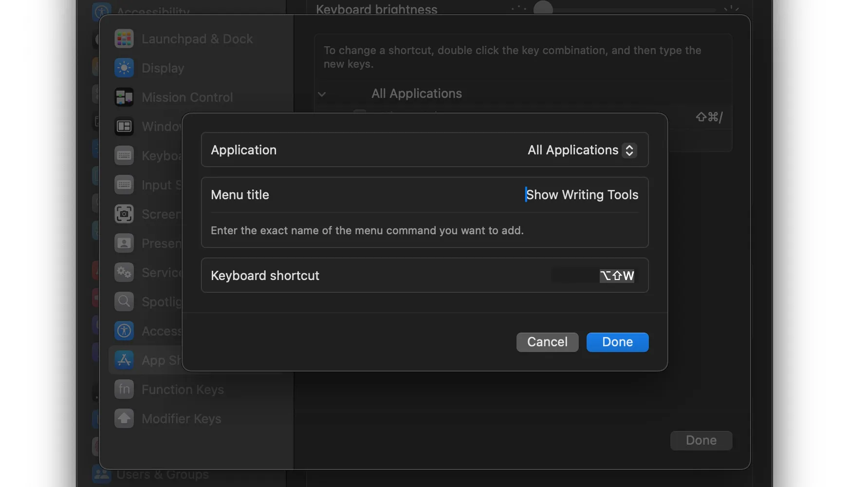 على نظام macOS، تحتاج إلى الانتقال إلى Keyboard Shortcuts في System Settings، وضمن App Shortcuts، إدخال Show Writing Tools كعنوان Menu. ثم، اختر تركيبة لوحة المفاتيح الخاصة بك، وبذلك تكون قد انتهيت.