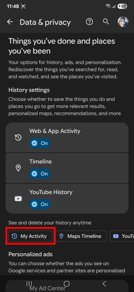 الآن بعد أن تمكنت من الوصول إلى ميزة “نشاطي” على جهازك، حان الوقت لإدارة إعدادات سجل حسابك في Google.