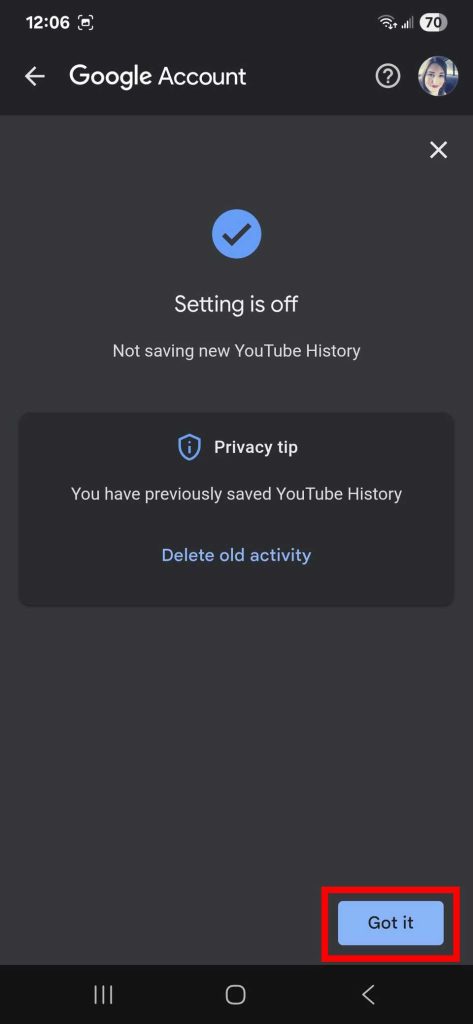 - اضغط على حسنًا لإنهاء العملية. أو بدلاً من ذلك، اضغط على حذف الأنشطة القديمة لمسح سجل YouTube المحفوظ.