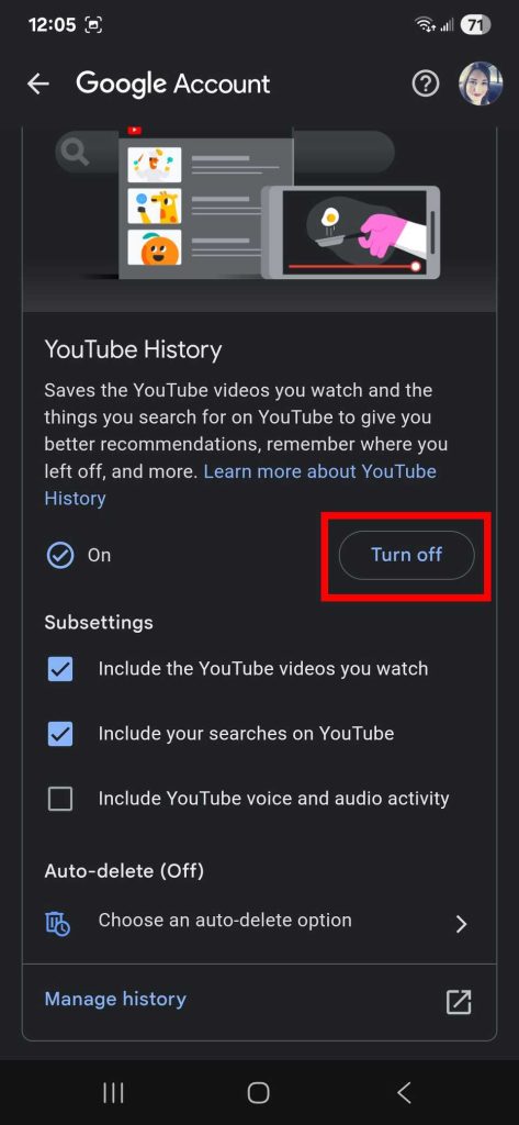 - انقر على زر Turn off ضمن قسم YouTube History.