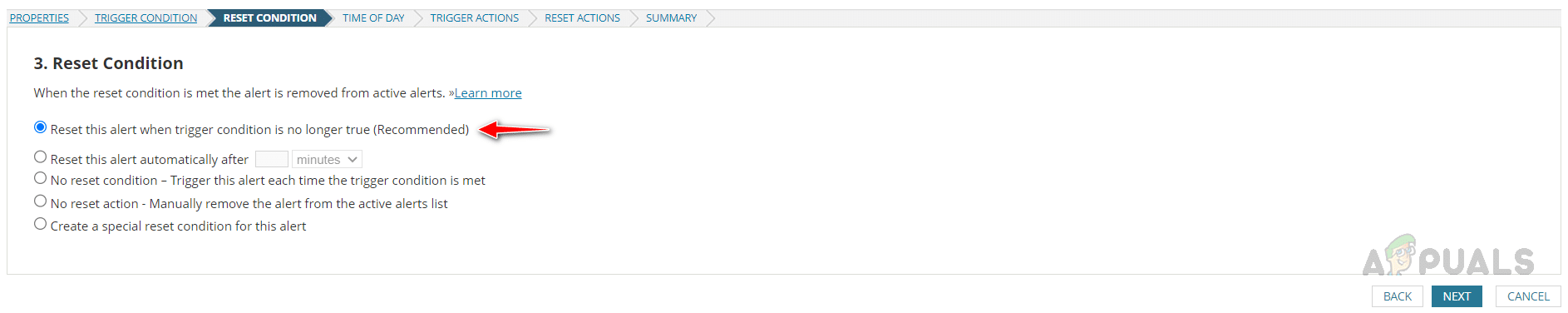 - يمكنك استخدام شرط إعادة الضبط الافتراضي، انقر على التالي بمجرد تعيين شرط إعادة الضبط.