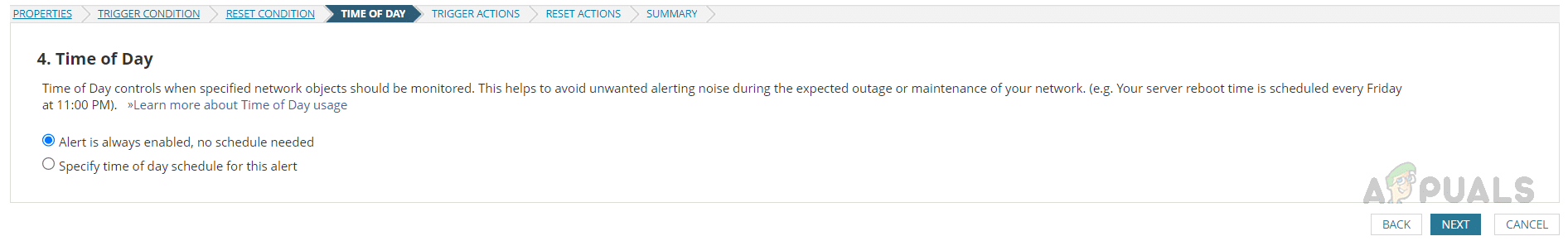 - حدد الخيار الضروري في قسم وقت اليوم بناءً على حاجتك، إذا كنت ترغب في تمكين التنبيه دائمًا فحدد الخيار الأول، وإذا كنت ترغب في تمكينه/تعطيله في فترات زمنية معينة فحدد الخيار الثاني ثم حدد الوقت الذي ترغب في جدولته.