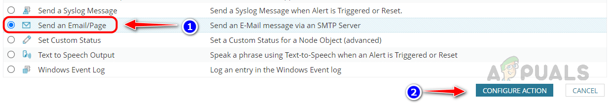 - لدى SolarWinds خيارات متعددة لإجراءات التشغيل، هنا دعنا نرى كيفية إعداد إجراء إشعار بالبريد الإلكتروني.