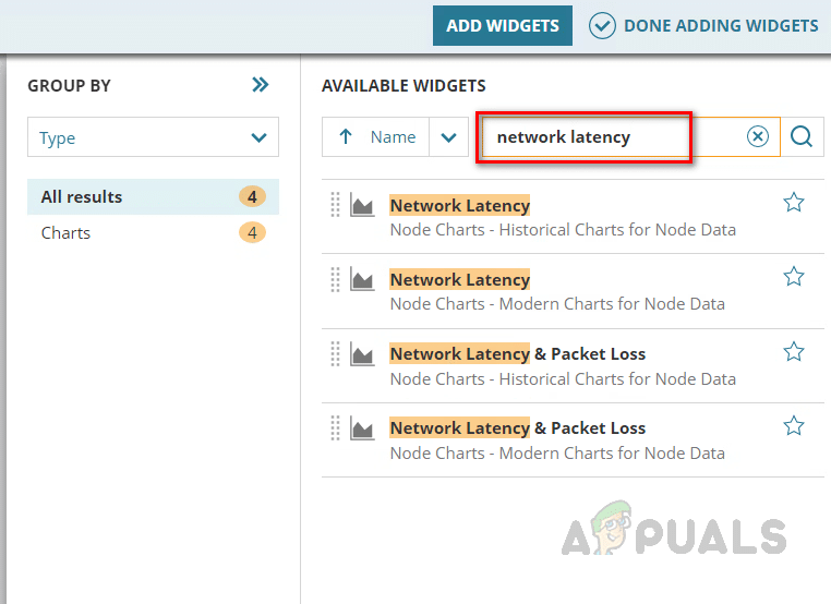 - اسحب وأفلت الأداة المصغرة “زمن انتقال الشبكة وفقدان الحزم” (Network Latency & Packet Loss) من نتائج البحث.
