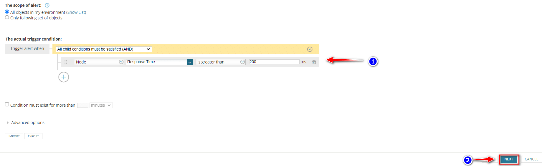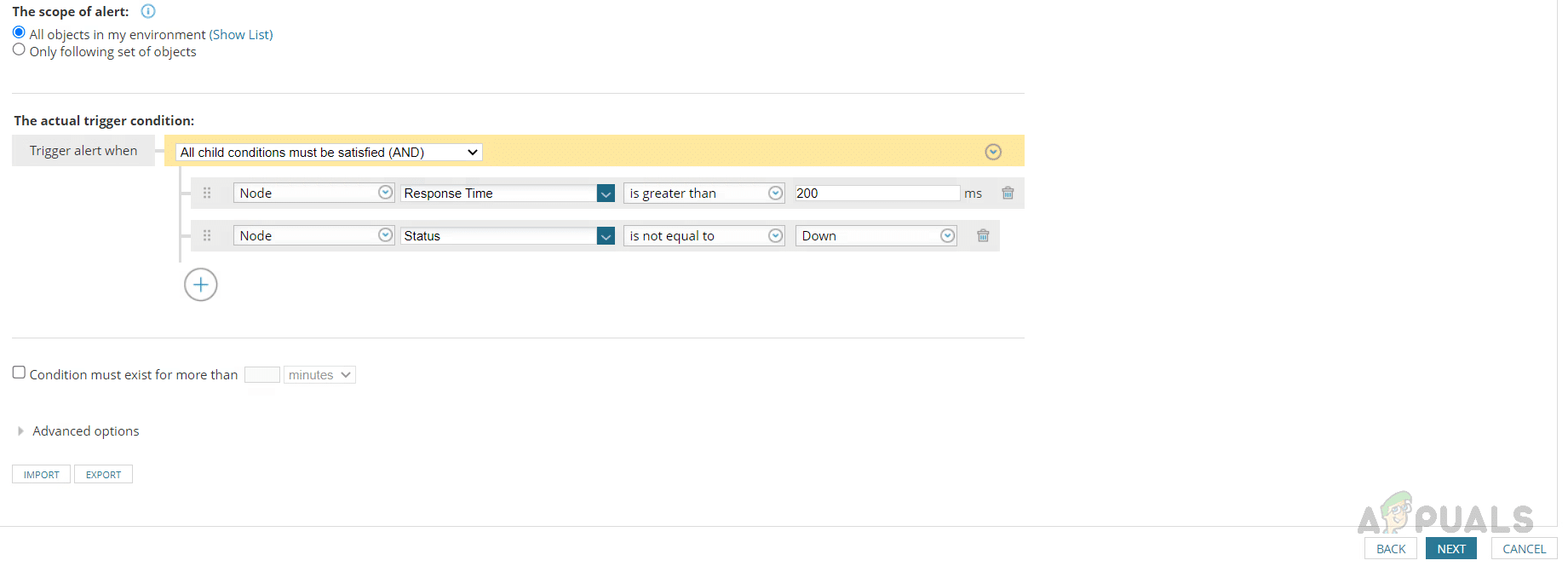 - قم بإعداد شرط التنبيه أدناه، يمكنك زيادة أو تقليل عتبة وقت الاستجابة حسب بيئتك. يتم تشغيل التنبيه كلما تجاوز وقت الاستجابة 200 مللي ثانية ويجب ألا تكون العقدة في حالة توقف. لمعرفة كيفية اختيار المتغيرات لشرط التشغيل، ارجع إلى المقال استخدام تنبيهات SolarWinds المتقدمة لإدارة مشكلات الشبكة.