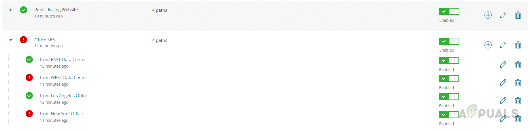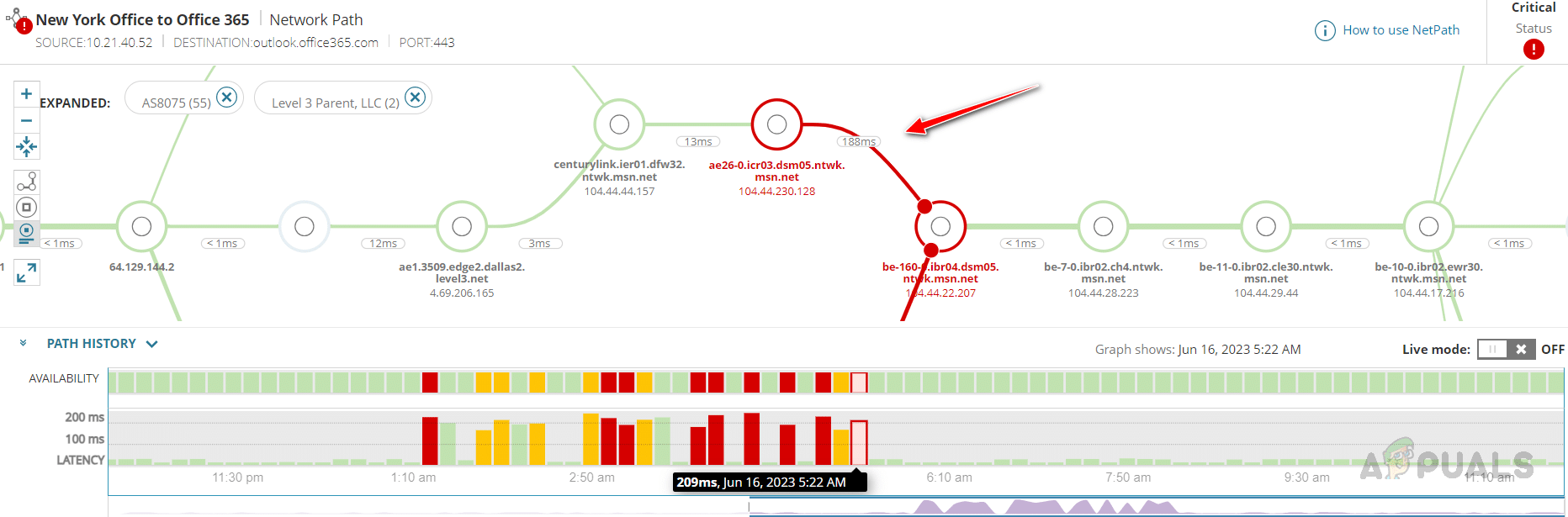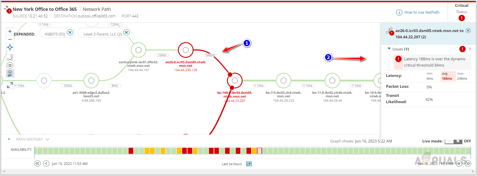 - يمكنك رؤية وقت استجابة المسار، وإذا تجاوز عتبة SolarWinds، فسيتم تمييزه كحرج ويظهر باللون الأحمر.