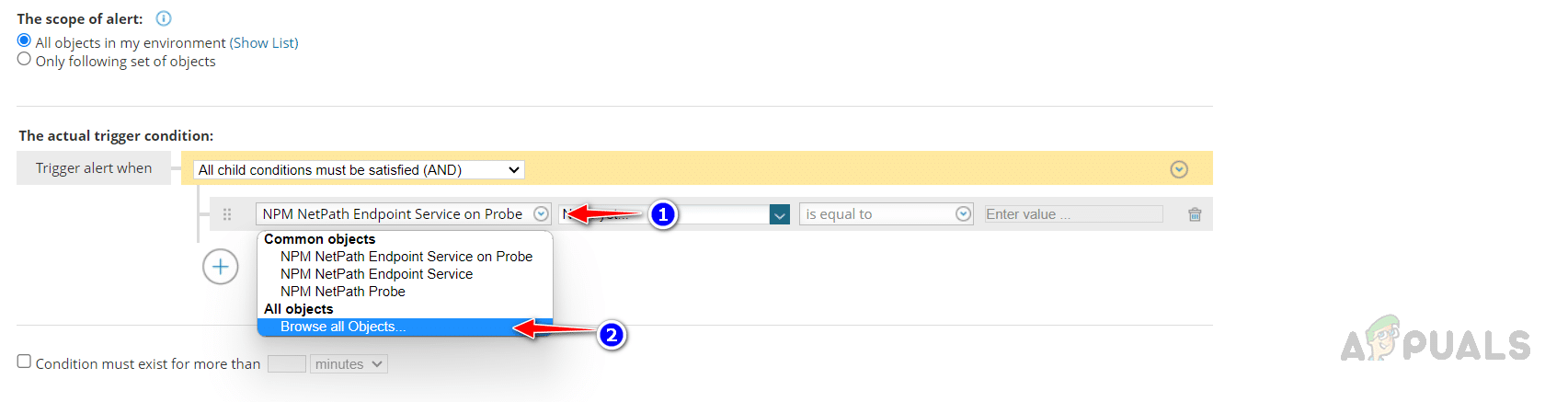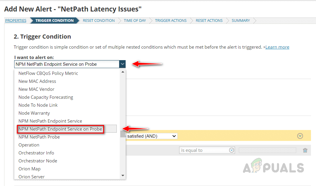 - حدد NPM NetPath Endpoint Service on Probe من القائمة المنسدلة أرغب في التنبيه بشأن.