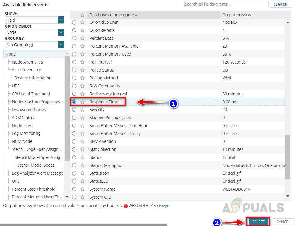 - حدد زمن الاستجابة من جدول العقدة ثم انقر على تحديد.