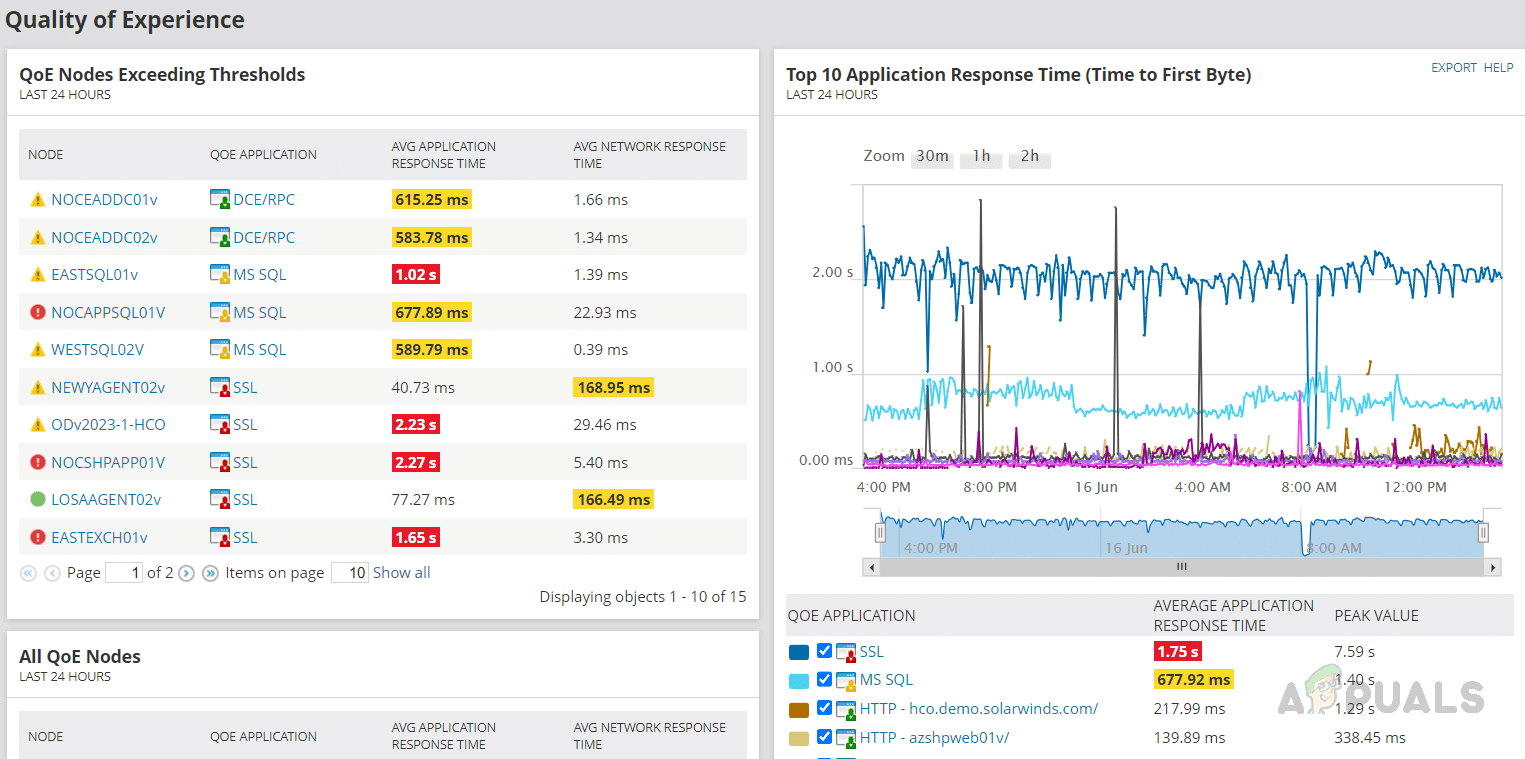 تقدم SolarWinds ميزة استثنائية أخرى تسمى QoE (SolarWinds QoE) لإجراء تحليل عميق للحزم. باستخدام SolarWinds QoE، يمكن لمديري الشبكات مراقبة مشكلات زمن الوصول (الكمون) عن كثب. تقوم SolarWinds QoE بتحليل حركة المرور بذكاء وتحديد ما إذا كان الكمون قد حدث في طبقة الشبكة أو طبقة التطبيق. يقلل هذا من الجهد اللازم لتحديد مكان حدوث المشكلة، سواء كانت في الشبكة أو التطبيق. يمكن للمسؤولين المعنيين البدء فورًا في استكشاف المشكلات وإصلاحها للتخفيف من أي تأثير كبير على المؤسسة.