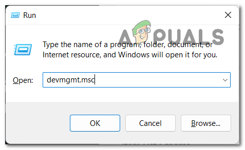 - بمجرد الانتهاء من ذلك، تحتاج إلى فتح صندوق حوار Run آخر بالضغط على مفتاح Windows + R وكتابة ‘devmgmt.msc‘ داخل شريط البحث، ثم اضغط على Enter لفتح Device Manager.